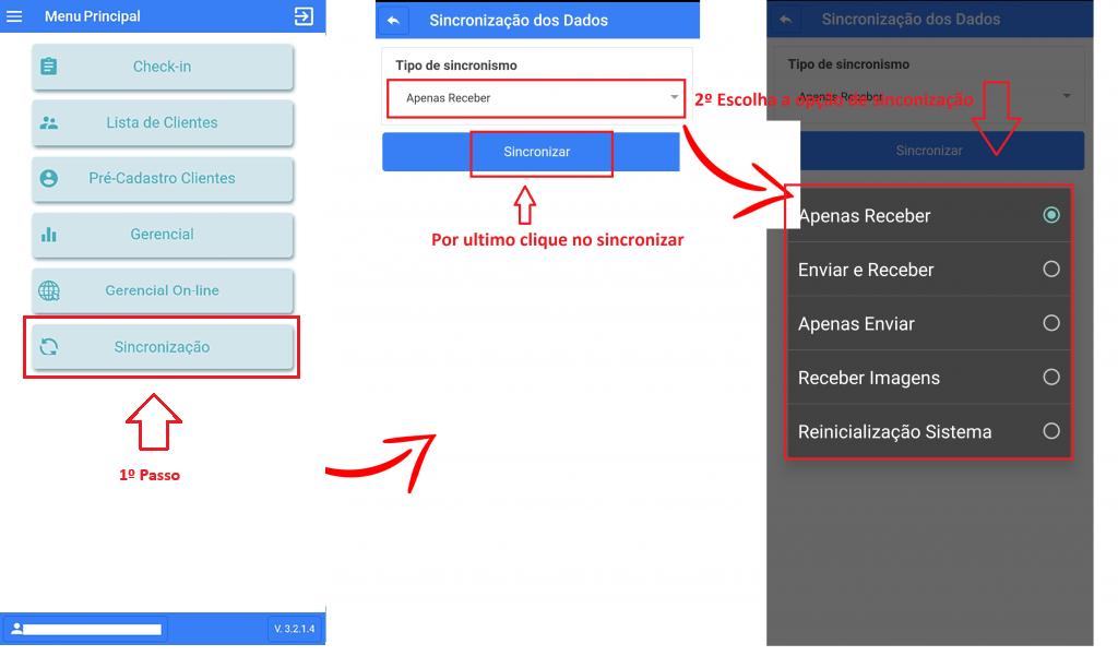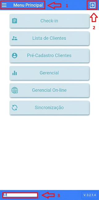 E todos os menus de acesso rápido, Chekin, Pre-cadastro clientes, Lista de Clientes, Sincronização, etc.