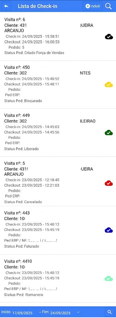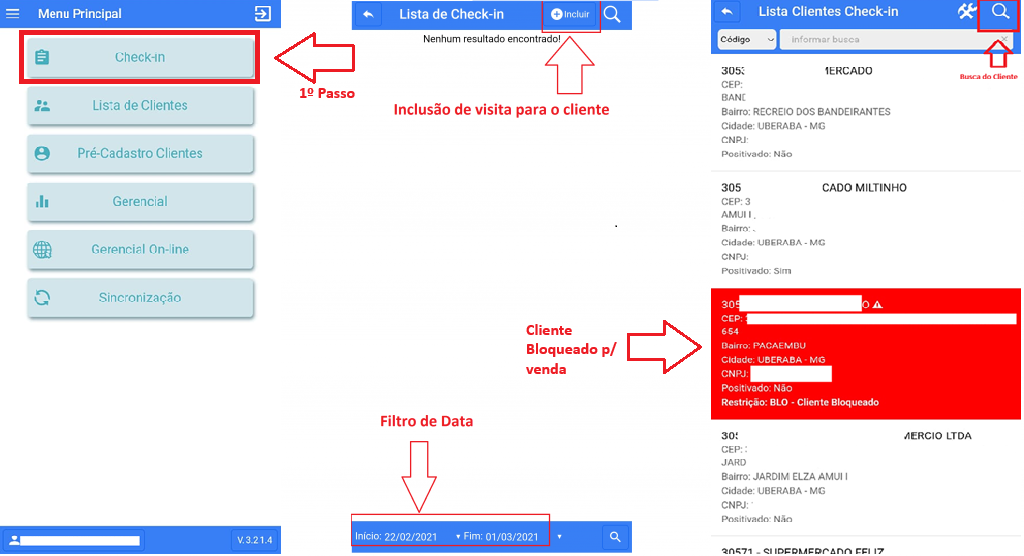 Após efetuar a sincronização, o usuário deverá clicar no ícone Checkin para iniciar a venda com seu respectivo cliente. Após clicar será aberto uma tela que de acordo com o filtro de data, o cliente será mostrado ao clicar no botão Incluir, conforme imagens abaixo, para agilizar a busca existe a opção da Lupa no canto superior direito