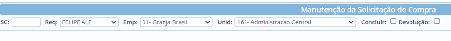 Informar a empresa e a unidade que será feito a solicitação de compra (dúvidas consultar o setor contábil). Ex: Administração central 161, Ave Nova 210 e Real alimentos 211. Clicar no botão Inc. Nova no canto inferior direito.