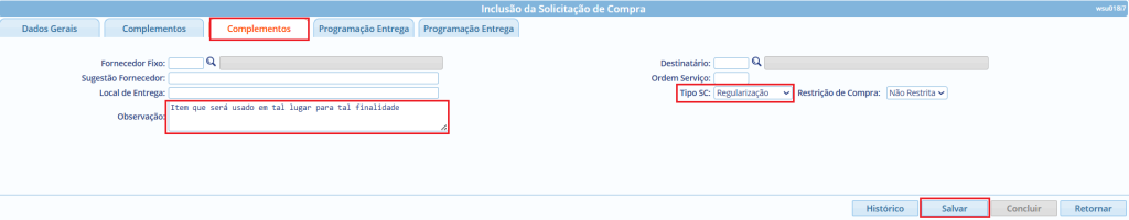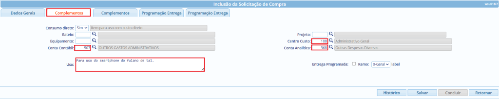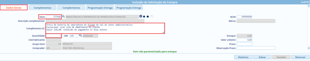 - Descrição complementar do item para o qual a solicitação está sendo feita.