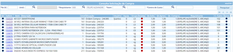 Informe o código do Requisitante e clique em pesquisar. Obs: Existe a opção de pesquisar por unidade, item e pelo número da solicitação, mas a mais viável é pelo requisitante.